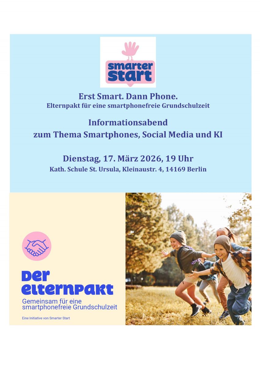 Als Schulgemeinschaft haben wir entschieden, am Präventionsprogramm „Erst Smart. Dann Phone.“ der gemeinnützigen Initiative Smarter Start teilzunehmen.